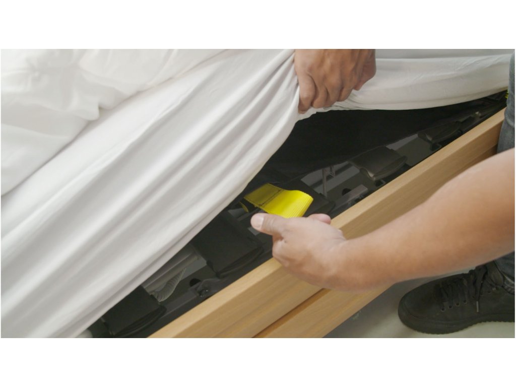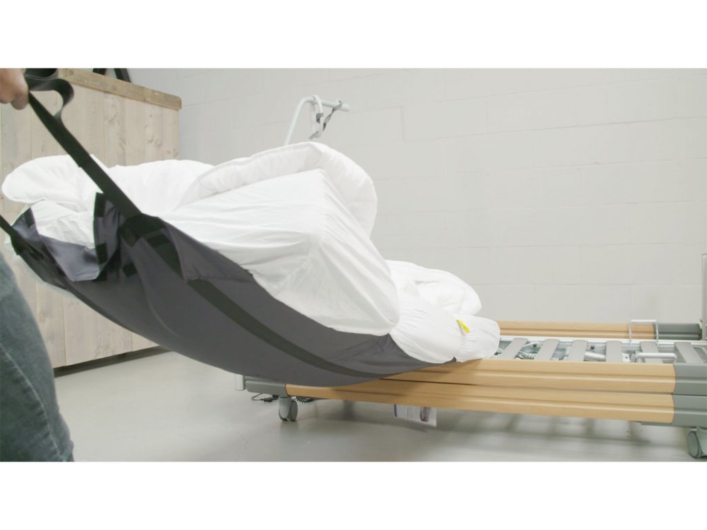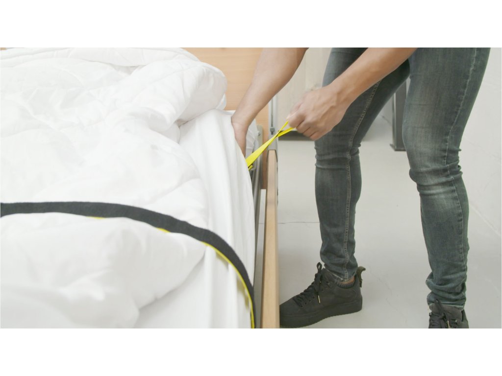 - V provedení předcházejícím překážení a zapletení podložky a/nebo jejích částí do rámu postele – popruhy a další volné části podložky jsou uloženy v úložných kapsách, zabraňujících nechtěnému uvolnění, zachycení nebo zamotání do rámu postele a jejích pohyblivých částí